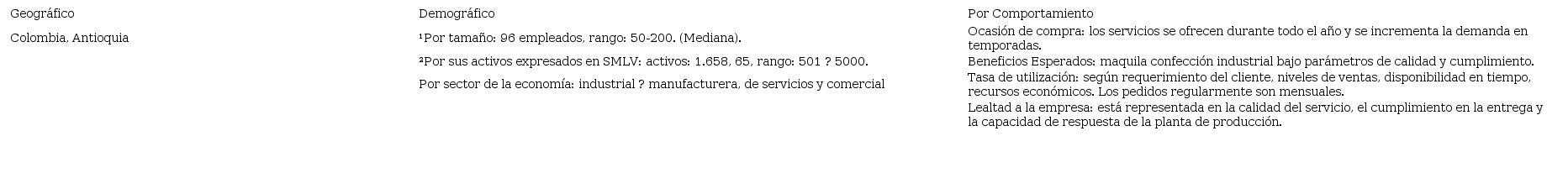 Para dar respuesta a las 3 últimas preguntas de las 12 establecidas: la 8. ¿Compras directas o por intermediario? De acuerdo con el modelo de mercadeo adoptado y al prestar servicio de maquila, la empresa contrata directamente con sus clientes, lo que significa que son ellos los encargados de recoger el producto terminado en el punto de fábrica, siendo así un beneficio en doble vía, haciendo negociaciones directas sin afectar los costos de acuerdo a la no presencia de intermediarios, además se agiliza el proceso con respecto a los tiempos de entrega. La 11. ¿Por qué los clientes no eligen el servicio de la empresa? Se puede afirmar que uno de los factores que impide a las empresas a hacer negociación para la prestación del servicio de confección con la pyme es por la distancia que presenta. Los clientes potenciales ubicados en el Valle de Aburrá tienen el 40?% de participación en el mercado y es donde está en mayor proporción la industria textil confección en Antioquia (DANE, 2017a). Finalmente, la 12. ¿Requerimientos específicos del cliente a futuro? Es sin lugar a dudas la modernización de la planta en términos de maquinaria tecnológica que vaya a la vanguardia de los nuevos modelos de fabricación en relación con la cuarta revolución industrial.