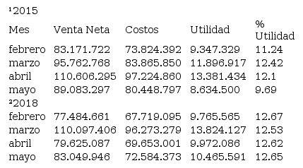 Define la interpretación de esta variable. Se tomó como referencia la relación de ventas y costos para el año 2015 y 2018. En la Tabla 3se presentaron datos de 4 de los 12 meses laborados y se analizó no sólo los costos, sino también las variables venta neta y utilidad. En las cifras que representan los costos descritos están los de producción y ventas. Haciendo el comparativo de ambos años se observó que, excepto el mes de abril, la utilidad fue superior para el periodo 2018, definido en un incremento de 1,43?% para el mes de febrero, 0,11?% marzo, 0,52?% abril y 2,96?% mayo, de lo cual se afirma que las utilidades se incrementaron significativamente después de la implementación de la herramienta organizacional, a excepción del mes de abril que fue 7.7?% menos con respecto al año 2015. Cabe resaltar que en este punto se expresa el incremento parcial en las utilidades, no en las ventas, debido a que se hace el análisis mensual, lo que es diferente en las ventas para el año 2018 donde no se obtuvo incremento y éstas fueron superiores en el año 2015.