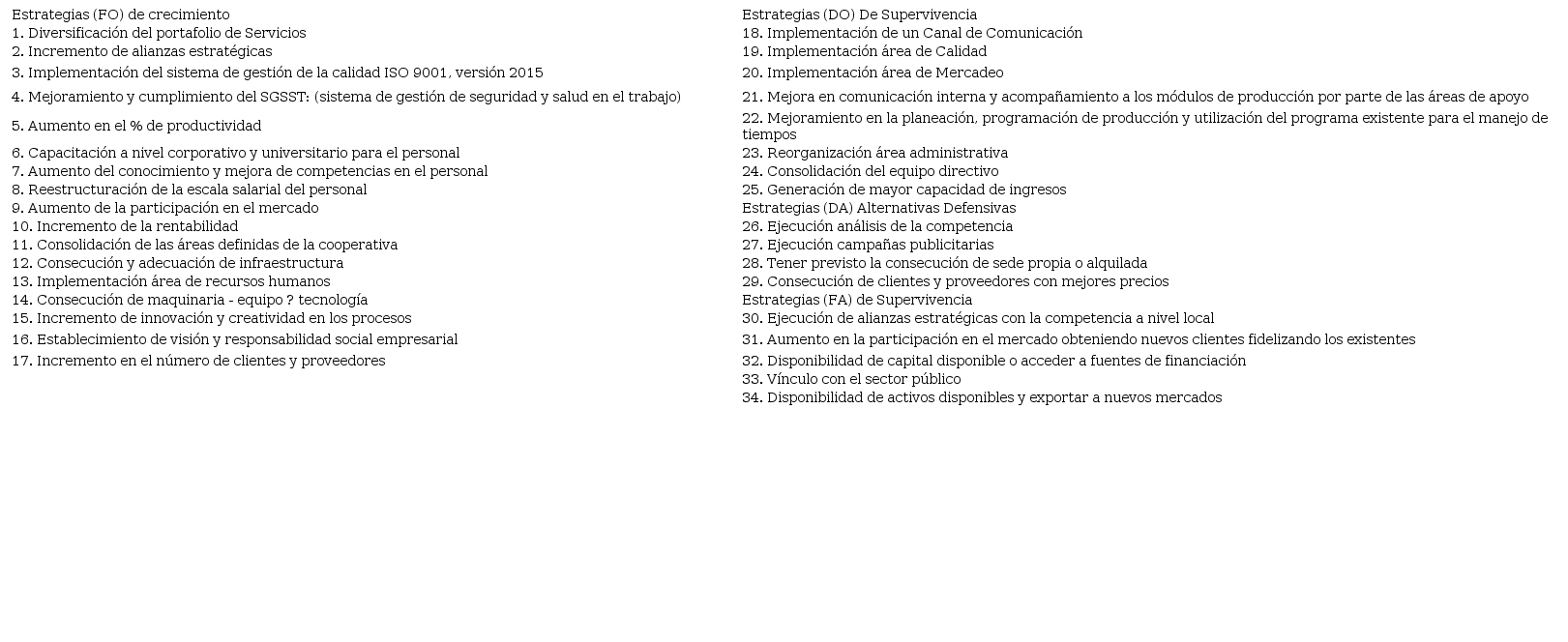 Según el orden, se analizan las variables externas e internas: oportunidades - amenazas, fortalezas - debilidades, de la herramienta DOFA aplicada. En total fueron 180 variables identificadas, expresadas así: 47 y 18 externas y 67 y 48 internas. Como resultado de cruzarlas se obtuvo 34 estrategias clasificadas en las áreas de: producción, recursos humanos, administrativa, mercadeo, recursos físicos materiales y financiera ( Tabla 4).