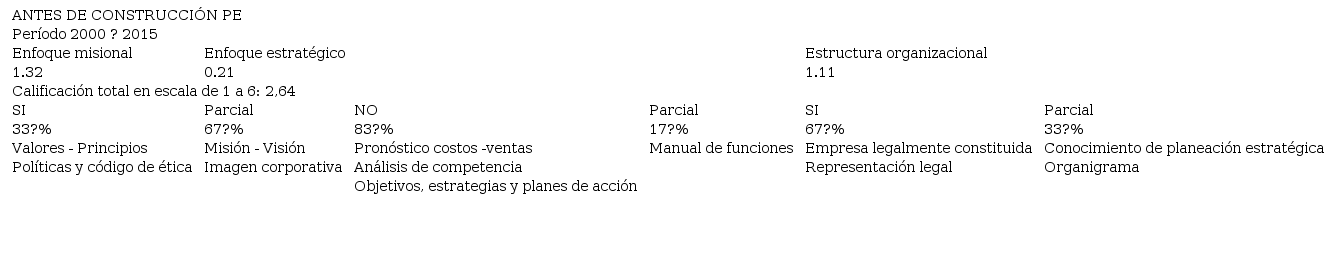 Para el periodo 2000 ? 2015, se logró identificar que la empresa tenía construido de forma empírica algunos elementos propios de la PE; también se pudo corroborar que a finales del 2015 inició, de manera formal, el proceso de implementación de la PE por lo que estableció la plataforma estratégica para el periodo 2016 - 2021. Lo anterior permitió que la evaluación de la tercera fase en el desarrollo de los numerales del 6 al 9 de la metodología se llevara a cabo en los dos momentos, antes y después de aplicar la herramienta. El proceso de evaluación está descrito en la Figura 2 fase III, donde el parámetro de evaluación establecido se definió en una escala de 1 a 6, y se determinó que para dar viabilidad a la herramienta el promedio ponderado debe ser ? 3. En la Tabla 5 y Tabla 6, respectivamente, se muestra de forma comparativa los resultados obtenidos de la evaluación, donde se indica la puntuación obtenida de los enfoques: misional, estratégico y estructura organizacional para cada año, así como el valor porcentual de cada una de las variables analizadas en ellos.