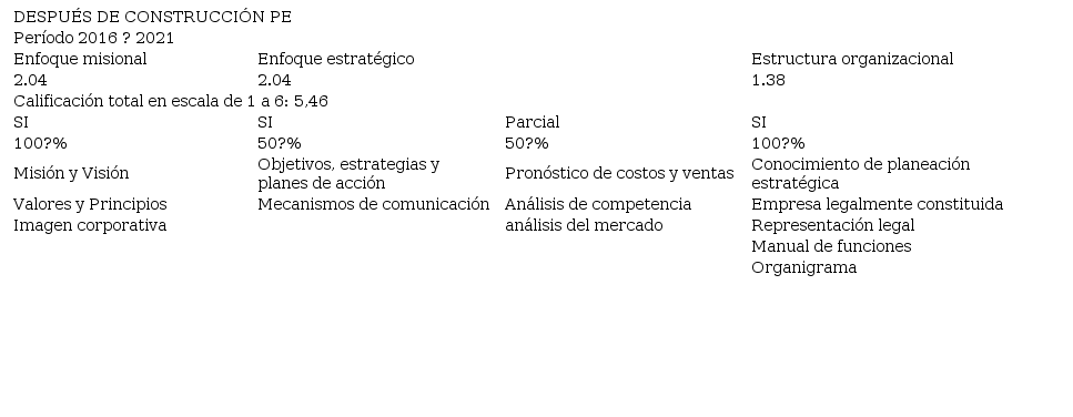 Aunque para el caso mexicano el modelo empleado no busca evaluar su aplicabilidad en la pyme, por lo que no se evidencia en los resultados su viabilidad, sí se muestran como principales hallazgos, en el proceso de PE, su desarrollo metodológico representado en la descripción de los objetivos estratégicos, las estrategias y planes de acción resultado de la matriz DOFA, así como la declaración de la misión y los valores institucionales. Además, la empresa cuenta con información en el área de mercadeo, resultado del estudio de mercado realizado.
