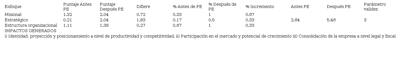 Con el análisis de los resultados ( Tabla 7), primero se mostró que la herramienta es viable una vez la empresa construye el proceso de planeación, generando impactos positivos para la organización. Posteriormente, la herramienta de evaluación permitió identificar las etapas para la construcción de la PE. Como valor agregado para el componente estratégico, el resultado del análisis previo del entorno macro y micro, numeral 5 fase II, estableció 34 estrategias corporativas por áreas de trabajo ( Tabla 4) con las cuales se trazaron los objetivos estratégicos y los planes de acción.