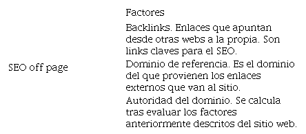 El SEO, a su vez, se divide en dos tipos: SEO on y off page. El primero tiene que ver con factores relacionados con la calidad del contenido, la utilización de palabras clave o la creación de información novedosa. Por su parte, el segundo guarda una estrecha vinculación con elementos vinculados a la autoridad del dominio, la reputación, la interacción de los usuarios con el sitio web o el número de enlaces externos que genere el sitio web (p.24).