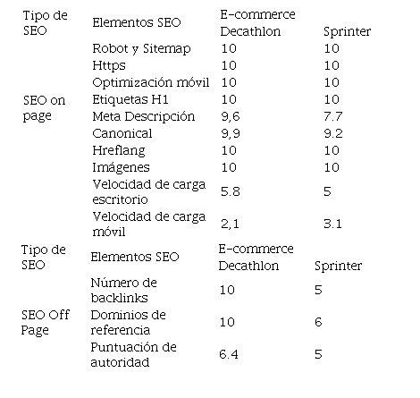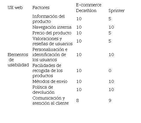 En cambio, las diferencias a nivel off page son más evidentes entre una página y otra. El número de backlinks que acumula la web de Decathlon es notablemente mayor en comparación a los resultados de Sprinter, obteniendo, además, dominios de referencia de mejor calidad. De esta primera unidad de análisis puede concluirse que, aunque los dos portales web tienen valoraciones correctas, Decathlon muestra un posicionamiento orgánico on y off page más sólido, lo que se traduce en un número mayor de visitas de internautas. En la Tabla 6 se muestran los datos recolectados en relación a la experiencia del usuario.