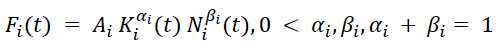 Let Fi (t), Ki (t), and Ni (t) stand for output, capital input, and labor inputs of the final goods sector, respectively. The production function of the final goods sector is specified as follows (1):