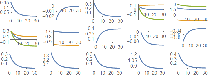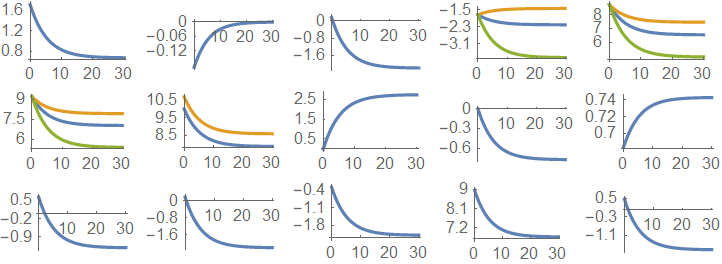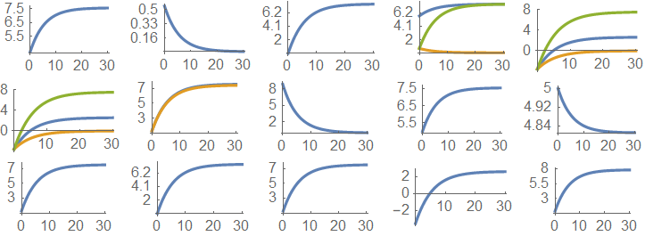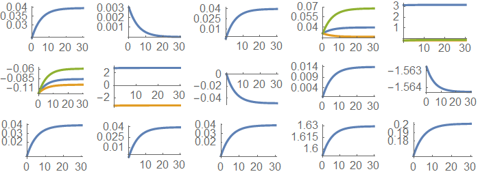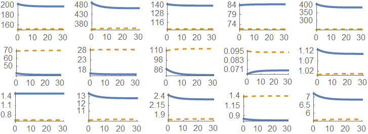 From the initial state, the national output falls. The growth rate is negative and is zero in equilibrium. The profits of duopolists fall. The three levels of output of the sectors change slightly. The profit of the duopoly’s product increases, and the interest rate rises. The wage rate falls. The representative household has a lower income, consumes less, and has a lower utility. The simulation demonstrates that the system becomes stationary in the long term. The simulation gives the equilibrium point as follows: