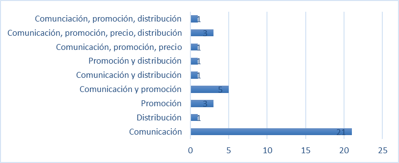 Al ser preguntadas sobre la utilización de estrategias de marketing, todas las empresas de la muestra respondieron de forma afirmativa. El 73,5 % indicó utilizar estrategias de marketing digital, el 18,1 % marketing tradicional y el 8,4 % ambas estrategias. En cuanto a la visión de la combinación de las estrategias de marketing, la mayoría (46 empresas), no especificó qué mix de estrategias incluían en su plan de comercialización. Entre las que lo especificaron (ver Figura 1), se resalta un mayor enfoque hacia la comunicación y promoción, y son pocas las empresas que mencionaron una combinación más integral del mix de estrategias de marketing (3 empresas).