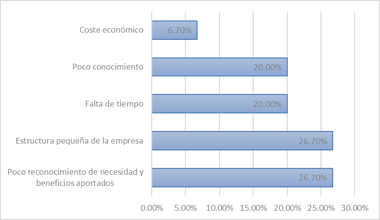 Las empresas que indicaron no utilizar estrategias de marketing digital (18,1 %), identificaron como principal causa el poco reconocimiento de los beneficios que estas estrategias aportan a la empresa, ya que mencionaron que son empresas familiares, de manera que van siguiendo las estrategias utilizadas de generación en generación y, como es satisfactorio para ellas, creen que es suficiente. Por tanto, por tradición y cultura y falta de necesidad no lo ven beneficioso. El tamaño, el tipo de las empresas, el tipo de producto, de trabajo y clientela de las pymes también se identificaron como una barrera (ver Figura 2).