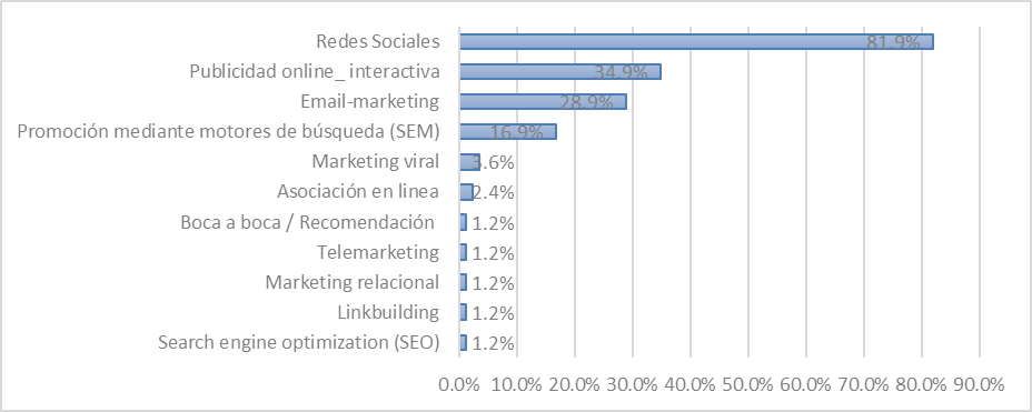 Los resultados indican que la mayoría de las empresas emplean las redes sociales en sus procesos de comercialización, siendo la estrategia digital más priorizada (ver Figura 3). La publicidad interactiva online, el e-mail marketing y la promoción mediante motores de búsqueda forman el conjunto de estrategias digitales más populares, aunque muy por debajo del porcentaje de empresas que dedican tiempo y esfuerzo a trabajar su visibilidad en algún tipo de red social.