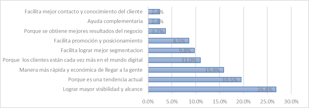 Los resultados identifican un conjunto de motivos por los cuales las pymes priorizan sus inversiones en estrategias de marketing digital (Ver Figura 4). Alcanzar un mayor número de público potencial se identifica como la principal motivación, ya que las pymes han afirmado que el objetivo es aumentar la visibilidad de la empresa en entornos online para la obtención de una mayor audiencia. Las otras dos principales motivaciones están asociadas con, por un lado, el seguimiento de tendencias, y por otro, con la percepción de que las estrategias de marketing digital son más económicas a la hora de lograr un mayor número de potenciales clientes. Otro motivo está vinculado con la presión impuesta por la sociedad digital, ya que las empresas han considerado como un factor importante en priorización de las estrategias digitales la necesidad de poder conectar con un público que cada vez más prefiere relacionarse con las empresas en un entorno más virtual.