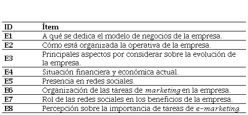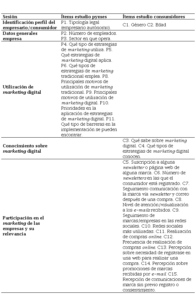 El instrumento estadístico utilizado está dividido en dos secciones: la primera determina el perfil de las empresas participantes y recoge datos generales de cada una de las empresas, como el número de empleados o el sector en el que opera; y la segunda consta de ítems relacionados con la utilización y aplicación de las estrategias de marketing digital. En la Tabla 3 se muestran los ítems del instrumento utilizado.