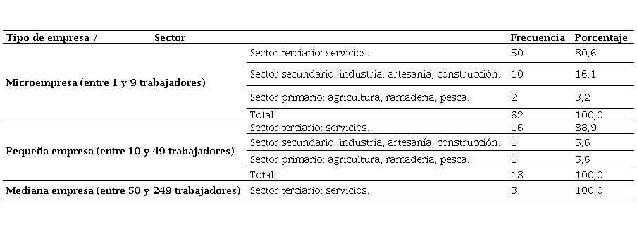 Aplicando un muestreo aleatorio simple, considerando un nivel de confianza del 95 %, un error máximo del 5 %, y un nivel de respuesta esperado del 100 % para una población total de 29 600 pymes, se determinó una muestra de 379 empresas. El cuestionario estructurado en la plataforma Google Forms se envió por correo electrónico y se distribuyó a través de redes sociales. Se obtuvo un resultado final del 21,9 % (83 pymes). En total, el sector de servicios está representado por 69 empresas (83,1 %), siendo las microempresas las más representadas en la muestra final (74,7 %). La mayoría de las empresas en su perfil legal cuentan como empresarios individuales, representadas por un 88 %. El perfil de los responsables de las empresas encuestadas se compone de directivos, gerentes, propietarios o responsables del área de informática, marketing o comunicación. La distribución de la muestra final obtenida se puede observar en la Tabla 2.