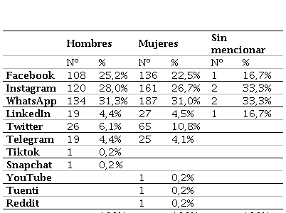 En cuanto a las redes sociales, el 73,2 % sigue a alguna marca o empresa que les guste. Las mujeres son más seguidoras de las marcas (60,3 %) que los hombres (38,9 %). Si analizamos por grupos de edad, el grupo de entre 20 y 30 años es el que más concentra usuarios que siguen marcas en las redes sociales (42 %). Encontramos un porcentaje más reducido en los grupos de entre 40 y 50 años (21,4 %) y más de 50 años (21¬%). El grupo de 30 a 40 años acumula un 12 % de participantes que han afirmado hacer seguimiento de marcas. Entrando a observar cuáles son las redes sociales que los participantes utilizan con más frecuencia, las plataformas de Instagram y WhatsApp son las más populares para ambos sexos, seguidas de Facebook. Twitter sigue como la cuarta plataforma más mencionada, siendo más utilizada por las mujeres. Telegram aparece en quinta posición, seguida de otras plataformas citadas de manera más residual. En cuanto a diferencias en preferencias de plataformas según grupos de edad, WhatsApp, Instagram y Facebook son las más utilizadas en todos los grupos, siendo Facebook la red menos utilizada por el grupo de entre 30 y 40 años. TikTok, Snapchat y Reddit fueron indicados por los grupos de más de 50 años, y entre 30 y 40 años, respectivamente. Los grupos de edad que mencionan ser usuarios más asiduos de Twitter están entre los 30 y 40 años, seguidos de los de entre 20 y 30 años (ver Tabla 5).