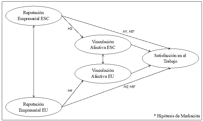 En definitiva, en este estudio se plantea que, para el caso de los trabajadores en condición de tercerización, factores como la reputación empresarial percibida por ellos con respecto tanto a la ESC como la EU son, efectivamente, fuentes de su propia satisfacción en el trabajo. No obstante, también se proyecta que dichas asociaciones se logran a través del favorecimiento de su propia vinculación afectiva con las empresas correspondientes. Y dado que la vinculación afectiva es al mismo tiempo un constructo-resultado del juzgamiento de los individuos hacia su propia empresa, y un constructo-antecedente de actitudes y percepciones de los individuos frente a su propia realidad laboral, las últimas dos hipótesis formuladas resaltan el rol mediador de dicho constructo. Dichas hipótesis sugieren lo siguiente: