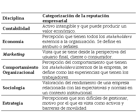 Particularmente, Fombrun y Van Riel (1997), realizan una categorización del concepto de reputación enfocado en la empresa desde diferentes perspectivas, las cuales se resumen en la Tabla 1.
