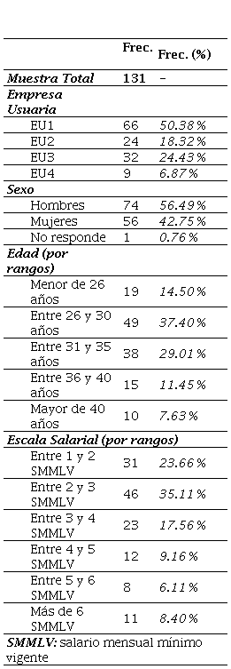 El estudio empírico se fundamentó en una encuesta de tipo transversal, en la que se pudo evaluar la percepción de una muestra de 138 trabajadores tercerizados vinculados a la misma ESC y prestando servicio a cuatro EU diferentes en Colombia. Allí, dichos individuos exteriorizaron sus juicios y percepciones en cuanto a los conceptos de reputación empresarial y vinculación afectiva para cada una de las empresas intervinientes, así como su concepto unificado de satisfacción en el trabajo.
