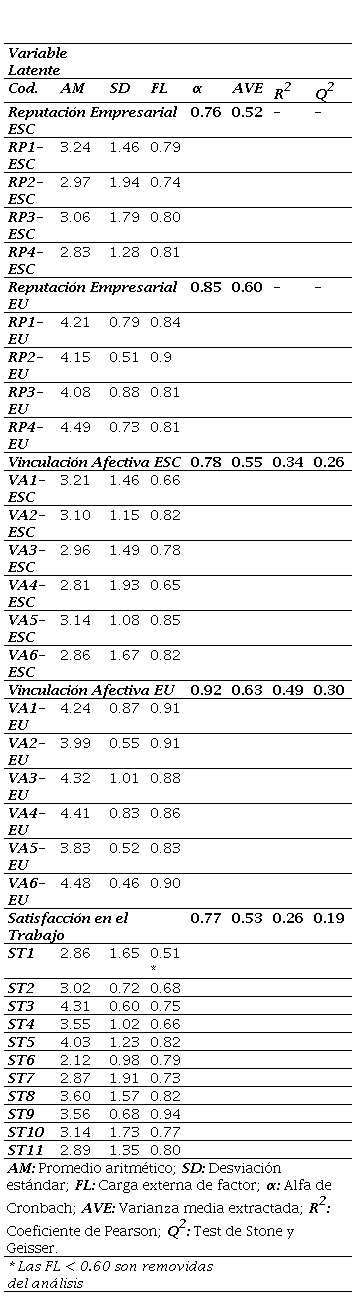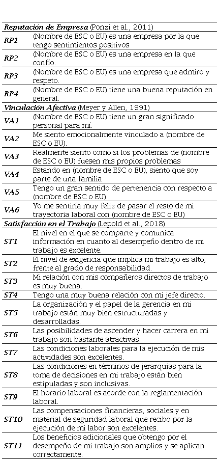 Para la medición de la reputación empresarial tanto de la ESC como de la EU respectiva, se utilizó una escala de cuatro ítems denominada RepTrak® Pulse, propuesta por Ponzi et al. (2011). La vinculación afectiva con respecto a las dos empresas intervinientes en la realidad de cada individuo se midió a través de seis ítems, presentada originalmente por Meyer y Allen (1991). Estas dos escalas fueron validadas previamente en estudios anteriores y han sido ampliamente utilizadas (Contreras-Pacheco, 2018; Contreras-Pacheco et al., 2021; García Villamizar et al., 2020). Por otra parte, para medir la que sería la variable exógena del modelo (satisfacción en el trabajo) se adaptó una escala compuesta por once ítems denominada PAJS-FI (por su nombre en inglés: Profile Analysis of Job Satisfaction – Facet Item), y que fue propuesta recientemente por Lepold et al. (2018), quienes reportaron adecuados niveles de confiabilidad y validez para estimular su utilización. Todos los ítems fueron traducidos al idioma español por parte de una traductora experta contratada por el autor. Ver Apéndice 1.