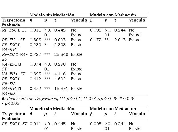 Seguidamente, los valores de β sin y con mediación, adicional a los p-valor y t-valor, indicando la existencia de significancia estadística (cuando p<0.1; y t>1.96), se pueden observar en la Tabla 4. Las condiciones aceptables de las mediciones respectivas siguen los parámetros descritos por (Hair et al., 2016).