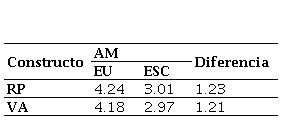 Finalmente, y como lo refiere la Tabla 2, a primera vista es notable la diferencia entre los promedios aritméticos de los ítems concernientes a la ESC y a la EU, siendo los de este último relativamente superiores a los del primero. Lo anterior se da, tanto para el constructo de reputación percibida, como para el de vinculación afectiva. Igual comportamiento se aprecia en cuanto a la dispersión de las respuestas de estos dos mismos constructos, lo cual se evidencia toda vez que las desviaciones estándar obtenidas para los valores de reputación percibida y vinculación afectiva de la ESC resultaron superiores a las desviaciones estándar obtenidas para los mismos dos constructos medidos con relación a la EU. De cualquier manera, en aras de comprobar la significancia de estas diferencias, las medias aritméticas de los valores obtenidos para todos los ítems de ambos constructos fueron sometidas a prueba. Para ello se parte de los datos reportados en la Tabla 5.