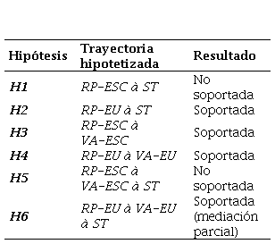 El detalle del análisis descriptivo de la muestra puede verse en la Tabla 2. Adicional a la EU respectiva, el modelo pudo ser controlado (p>0.1) por las variables sexo, edad, escala salarial. Lo anterior quiere decir que los resultados obtenidos no se alteraron de manera significativa al analizar las respuestas de dichas variables de manera independiente, tomando en consideración su efecto integrado sobre la variable endógena del modelo; esta es, satisfacción en el trabajo.