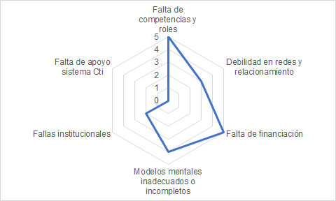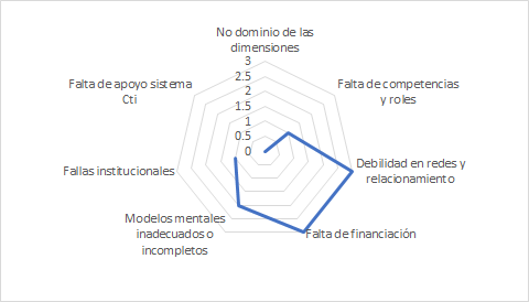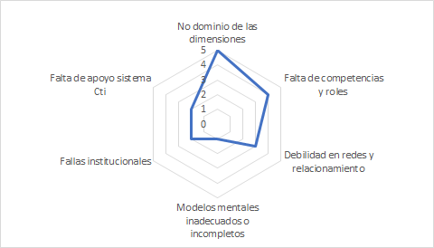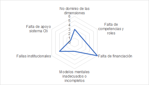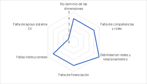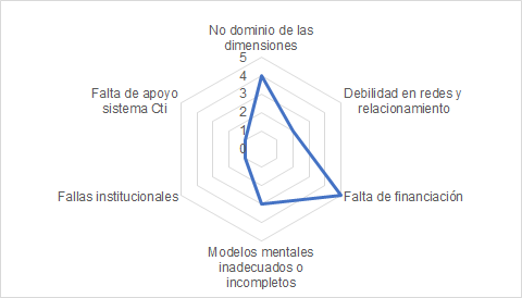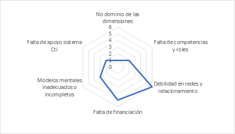 En la presente investigación se toma como referencia el estudio de Jiménez (2017) como base para establecer los posibles factores que dificultan el éxito de las innovaciones tecnológicas en la ciudad y, de esta manera, a partir de la calificación establecida por los entrevistados dentro del proceso de obtención de información primaria[1], priorizar aquellas barreras con mayor relevancia. De esta manera, se tomaron los siguientes factores: No dominio de las dimensiones, Falta de competencias y roles, Debilidad en los relacionamientos y redes, Falta de financiación, Modelos mentales incompletos o inadecuados, Fallas institucionales y Falta de apoyo al sistema CTi.