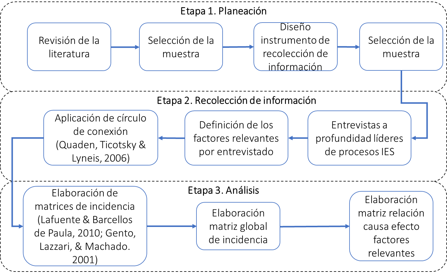 Tras establecer los factores relevantes para cada entrevistado, estos elaboraron y aplicaron un diagrama causal simplificado, denominado círculo de conexión (Quaden et al., 2006), que sintetizó aquellos identificados para cada intermediario y sus relaciones causa-efecto. Esta información se transfirió a matrices de incidencia (Gil Lafuente y Barcellos de Paula, 2010; Gento et al., 2001), donde se realizó la homogeneizaron de los factores de cada IES. A continuación, se realizó una matriz global de incidencia de los mismos, donde se observó cuántas entidades seleccionaron las relaciones causa-efecto detectadas en la matriz de incidencia.