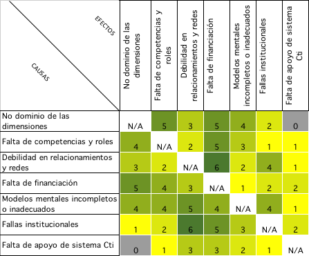 Cada celda representa el valor dado por los entrevistados a partir de la valoración con una escala Likert de 1 a 6, en la cual el intermediario indicó el efecto que tiene cada uno de los factores mostrados en las filas sobre aquellos establecidos en las columnas. De esta manera las relaciones causa-efecto con mayor peso entre todos las IES analizadas se presentan con tono verde oscuro (valor 6), las relaciones con peso igual o mayor a 50% se marcan con verde claro, las relaciones con peso entre 25 y 49% con amarillo, y las que tuvieron peso menor se marcan con color gris.