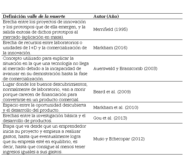 Frank et al. (1996) y Alunni (2020) describen el VM como una situación de fallo que ocurre cuando los innovadores no pueden acceder a financiación para el escalamiento y fabricación de un producto resultado de un proceso de I+D. Para Auerswald y Branscomb (2003), el VM constituye una brecha persistente para la innovación, que involucra restricciones financieras, falta de articulación entre técnicos y especialistas en negocios, deficiencias en infraestructura y divergencias entre intereses investigativos y comerciales. Markham et al. (2010), plantean el VM como un corredor entre investigación y desarrollo (I+D) y una fase final de desarrollo de nuevos productos donde se presentan restricciones de capacidades.