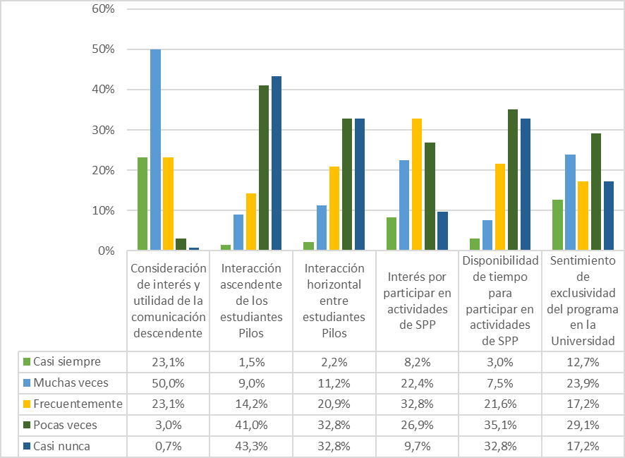 La predominancia del flujo descendente unidireccional de la comunicación, así como la poca interacción ascendente y horizontal por el bajo interés de los estudiantes en promover este tipo de relacionamiento ( Figura 1), dan lugar al desconocimiento por parte de las entidades superiores acerca de las experiencias y representaciones construidas por los Pilos de la sede, construyéndose en ellas una imagen distorsionada y poco acorde con la realidad organizacional ( Preciado-Hoyos & Etayo-Pérez, 2014).