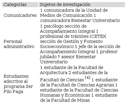 Para la selección de los comunicadores como informantes clave, se tomó como indicio la entrevista realizada en la prueba piloto al jefe de la Unidad de Medios de Comunicación (Unimedios), con el cual se identificaron las características administrativas sobre cómo opera la comunicación en la sede y se corroboró la información declarada en la política de comunicación por parte de la Rectoría con la resolución 101 del 10 de febrero de 2016, donde se define la comunicación como un mecanismo de regulación social que trasciende la idea de medios y la reconoce como elemento fundamental para lograr sus fines.