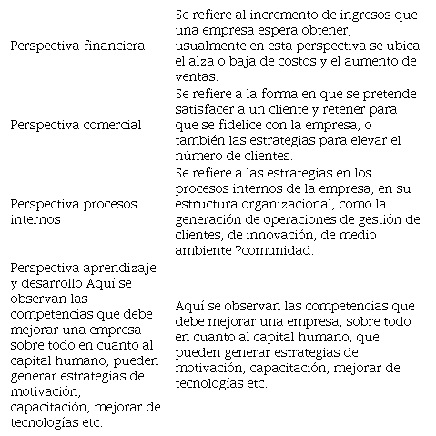 De esta forma, es posible entender que su nombre BSC se refiere al equilibrio que una organización puede obtener entre sus objetivos, sus medidas financieras y no financieras, sus indicadores y su actuación interna y externa, proporcionando una estructura para un sistema de gestión y medición estratégico, el cual a nivel de ejecución comprende diversas etapas, como la implementación de un estudio previo de la empresa y el mercado, la formulación de grupos de trabajo dentro de los diferentes departamentos de la empresa, para así llegar a la creación de la primera fase del BSC que es la creación del mapa estratégico. Este mapa integra 4 perspectivas: la financiera; la del cliente; la interna; y la innovación formación (ver Tabla 1).