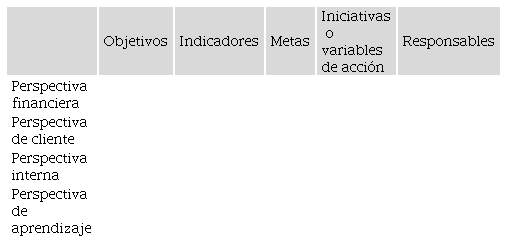 Con base en el mapa estratégico, se elabora la segunda fase del BSC, que es la tabla de control en la cual se añaden objetivos estratégicos con cada una de las 4 dimensiones. También unos indicadores de desempeño para medir los objetivos y unas iniciativas estratégicas; cada una de estas variables deben cumplir con las características de ser específicas, medibles, alcanzables, relevantes, y deben cumplirse en un determinado tiempo. Ver Tabla 2.