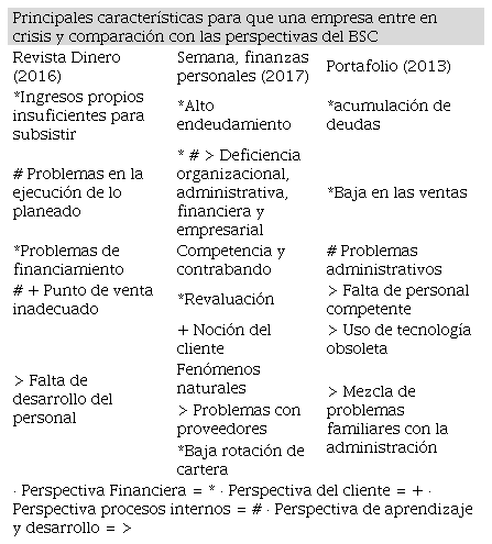 En esta medida, se realizó una compilación general de datos tomados de las principales revistas (Revista Dinero, Semana y Portafolio durante el periodo 2005-2017) que manejan el tema de economía en el país. Estas revistas ofrecen un panorama general del por qué una empresa entra en crisis e inclusive llegan a caer en la liquidación. Se puede observar que los factores señalados por las revistas se ubican dentro de las 4 dimensiones que maneja el BSC.