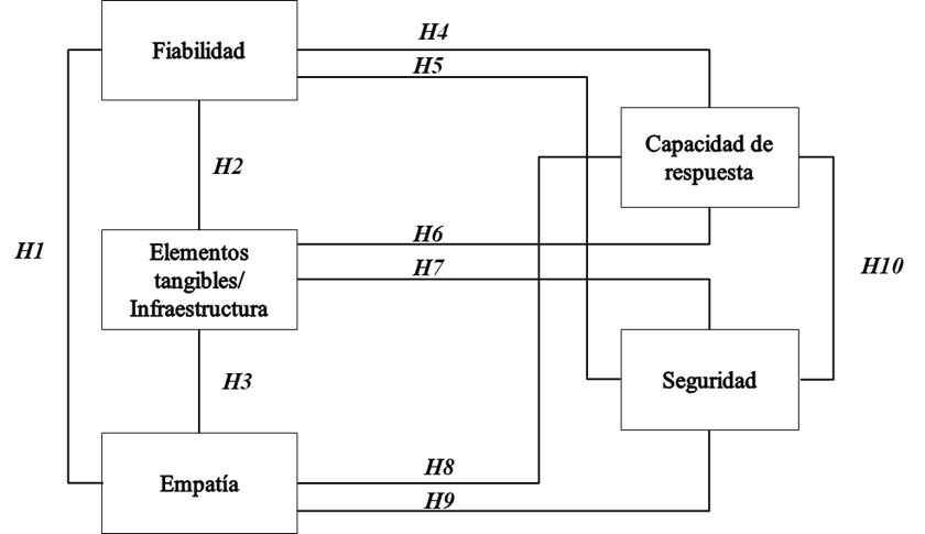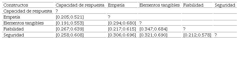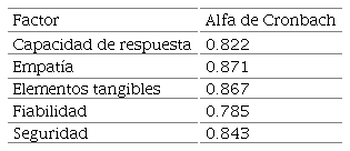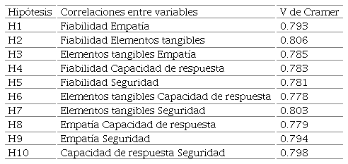Luego se procedió a identificar la fiabilidad de la escala de medida y verificar la capacidad explicativa del modelo SERVQUAL, para ello se calculó el alfa de Cronbach para las respectivas escalas de cada constructo. Posteriormente, se realizaron las pruebas de hipótesis en las que se estimaron estadísticos para el modelo estructural propuesto. En este punto, el interés se centró en determinar el grado de asociación entre constructos, cuyas relaciones están expresadas en el modelo de la Figura 1. Para ello se utilizó el estadístico V de Cramer, propuesto por Cramer (1946), el cual es un coeficiente basado en el estadístico chi cuadrado, que permite determinar nivel de asociación entre variables. Sus valores oscilan entre 0 y 1; siendo números cercanos a 1 los de mayor grado de asociación y valores cercanos a 0, los de menor. La justificación del uso de la V de Cramer en esta investigación radica en que este estadístico corrige el problema de las diferencias entre tamaños de las diferentes formas que podían tomar las variables, es decir, no afecta el tipo de la tabla de contingencia utilizada.