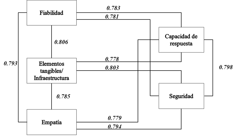 Los resultados obtenidos de esas relaciones hipotéticas muestran que el servicio recibido en términos de la seguridad tiene una correlación significativa con la fiabilidad (0.806), dejando ver que la confianza transmitida por el personal técnico en el momento del entrenamiento físico puede generar una buena experiencia en el usuario y es la herramienta clave para cambiar o mejorar la percepción que este tiene del servicio prestado, ya que desde el nivel de acceso con el entrenador se pueden suplir las diferentes necesidades del cliente y lograr que él incremente su grado de satisfacción con el servicio recibido. De forma similar, la empatía tiene una fuerte asociación con la fiabilidad (0.793), para este grado de correlación se evidencia que un adecuado interés por parte del personal de apoyo para solucionar las dudas que tiene el deportista, presenta repercusiones positivas frente a la percepción de satisfacción de este.