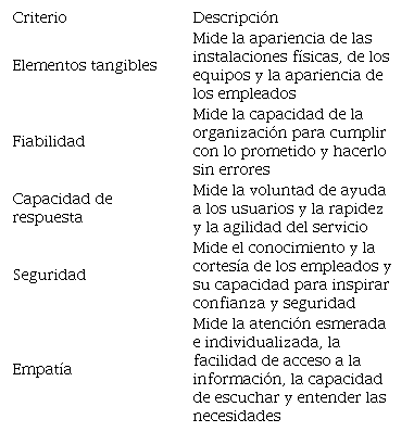 De la misma manera, se expone el modelo Servqual como mecanismo de medición para hallar las posibles brechas entre la calidad entregada por las organizaciones y las perspectivas que los clientes tienen sobre la calidad de los servicios, lo que representa una valiosa oportunidad para la toma de decisiones coherentes con la realidad, necesidades y satisfacción de los usuarios ( Chhabra, 2013).