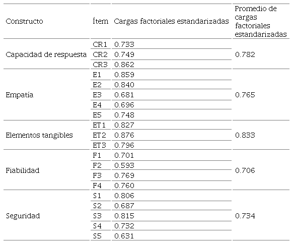 En primera instancia se tiene la validez convergente del modelo, la cual evalúa el grado en que la medida de los ítems que recogen un mismo concepto están correlacionados, donde se analiza la fiabilidad en dos niveles: fiabilidad de los ítems observables y la fiabilidad de los constructos ( Calvo, Martínez & Juanatey, 2013). En la validación de este estudio no fue necesario eliminar ningún indicador, dado que su carga factorial estandarizada arrojó resultados superiores a 0.6, lo que es considerado como evidencia de que el modelo es fiable ( Bagozzi & Yi, 1988) y el promedio de las cargas fue superior a 0.7 para todos los constructos ( Hair, Anderson, Tatham & Black, 2001), tal como se muestra en la Tabla 2.