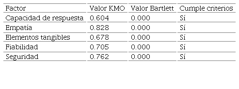 Se observa en la Tabla 3 que los coeficientes arrojados por el software SPSS para cada uno de los constructos alcanza a cumplir con los criterios de aceptación de Lévy, Martín & Román (2006), en el que valores KMO alrededor de 0.7 o superior, implican factibilidad para realizar la técnica de reducción de datos.