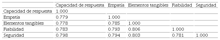 Por otro lado, los elementos tangibles/infraestructura reflejan también un alto nivel de asociación con los constructos seguridad (0.803) y empatía (0.785), lo que puede estar indicando que las instalaciones físicas, equipos, personal y materiales de comunicación no solo permiten a los usuarios interactuar con el proveedor de servicios de entrenamiento personal y recibir atención personalizada, sino que también contribuye a la creación de un vínculo físico con la entidad, y de esta manera obtener beneficios a través del establecimiento de canales de comunicación que difundan información sobre líneas de servicio emergentes, sedes nuevas, mejores políticas de servicio y cualquier otro tipo de información que le de exclusividad a los usuarios antiguos y garantías a los que apenas estén ingresando.