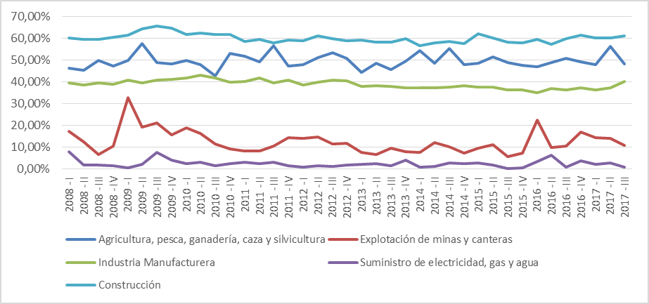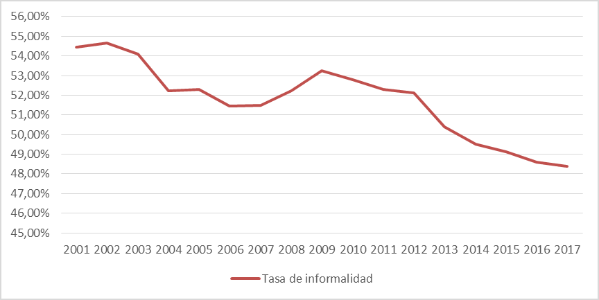 A finales de los años noventa y en los albores del año 2000, la tasa de informalidad era cercana al 60 %. En el periodo observado (2008 ? 2017) se puede apreciar una tasa aproximada del 51,23 % para el año 2008, la cual se mantiene relativamente estable (entre 50 % y 52 %), comenzando un descenso progresivo desde el 2012, hasta llegar a 47,56 % en el tercer trimestre del año 2017.