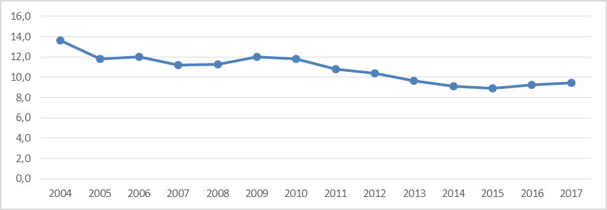 Desde 2004, la tasa de desempleo registra un descenso por debajo del 12 %, hasta el año 2008, lo cual se explica por un buen desempeño económico y una tasa de informalidad que se incrementa en el periodo 2006 - 2008. Entre el año 2008 y 2010, la tasa de desempleo refleja un leve incremento, tal como se ve en la figura 2, que puede obedecer al período de la crisis hipotecaria que inició en 2008, y cuyas repercusiones afectaron la mayor parte de las economías mundiales; esta empieza a experimentar una reducción sostenida por debajo del 10 %, a partir del año 2013, aunado con una disminución en la tasa de informalidad a partir del mismo periodo (por debajo del 50 %), como se observa en la Figura 1. Esto se traduce en un aumento al acceso de trabajo digno y formal, así como mejores condiciones laborales y un sector productivo con mayor capacidad de empleabilidad.