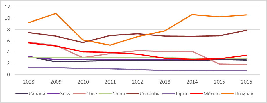 La Figura 3 muestra el diferencial de tasa de interés entre varios países; como puede observarse, para el caso de Colombia, este indicador es de los más altos, y el segundo más alto, por debajo de Uruguay (aunque para el periodo 2010 ? 2012 fue mayor el de Colombia). Se observa, también, que países de la región como México y Chile tienen unos diferenciales en tasa más bajos, cercanos a los de países como Suiza y China. El hecho de que Colombia tenga un diferencial tan alto puede ser un factor contribuyente a la alta tasa de informalidad (debido a los factores explicados anteriormente), y más aun teniendo en cuenta la vasta desigualdad en tecnología y capital entre los dos sectores, formal e informal (lo cual sería explicado por una tasa de interés alta).