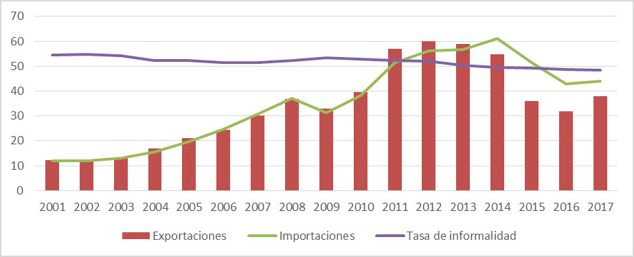 La evidencia empírica devela que no siempre el comercio mundial genera informalidad, pero si es claro que, para el caso de Colombia, la apertura económica y el posterior desarrollo del comercio exterior del país, si tuvo un efecto en el aumento de la informalidad, teniendo en cuenta que desde el año 2013 la balanza comercial viene incrementando una brecha negativa; entonces, es fácil abstraer de este indicador que las importaciones realizadas por los colombianos son mayores a lo que se exporta, y donde muchas de esas importaciones son productos intensivos en mano de obra que compiten con las industrias ya establecidas en el país, lo cual desplaza trabajadores y genera informalidad como vía de escape. En la Figura 4 puede apreciarse el comportamiento de estas dos variables de la balanza comercial, en el período 2000-2017, y donde, desde el año 2013, se refleja un punto de quiebre que ha mostrado la brecha entre las importaciones y exportaciones del país.