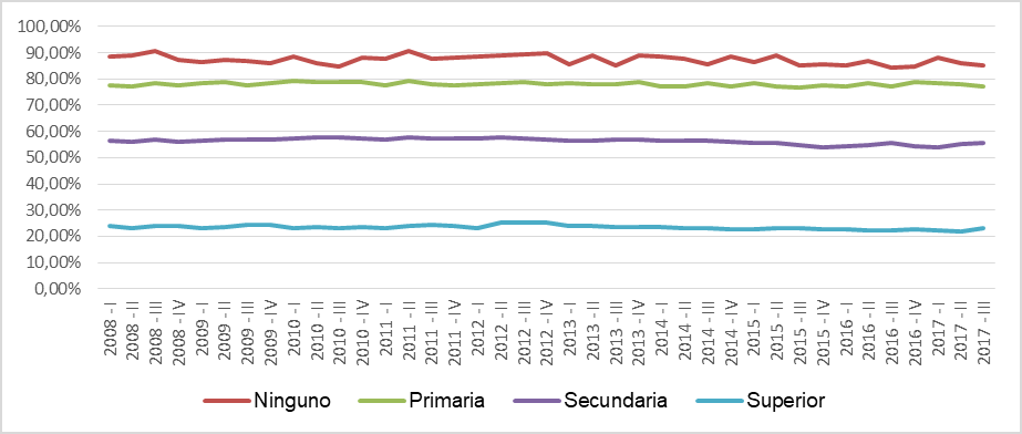 La Figura 5 revela la tasa de informalidad según el nivel educativo de la persona; aquellas sin ningún nivel educativo y con básica primaria, presentan la tasa más alta - con más del 80 % -, seguido por personas con educación secundaria ?cerca de un 60 %-, y finalmente, individuos con un nivel superior de educación ? cuyo registro es cercano al 30 % -. Las tasas son estables a través del tiempo, y la evidencia refleja que el nivel de educación tiene una relación inversa con la probabilidad de ser informal: a mayor nivel de educación, menor es la probabilidad de incurrir en la economía informal.
