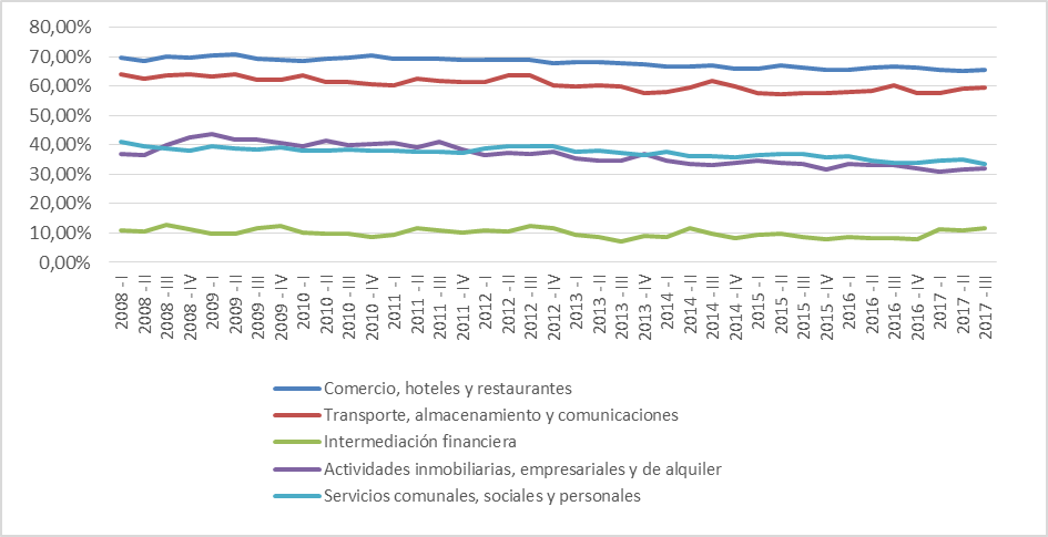 Estas situaciones generan un debilitamiento, reflejado en las altas tasas de informalidad de estos sectores; además, hacen que ramas más relacionadas con el sector terciario, como: las actividades inmobiliarias, empresariales y de alquiler; y la intermediación financiera, presenten tasas de informalidad más bajas, al ocurrir una migración de inversión al sector terciario.