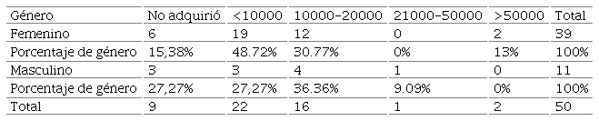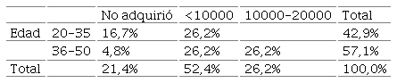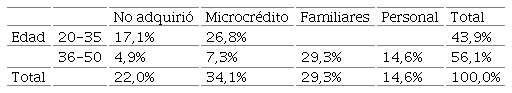 Al hacer el cruce y análisis de las variables «Edad» y «Origen de los recursos», se llega a la conclusión de que las personas más jóvenes (20-35 años) no adquirieron recursos o acudieron al microcrédito, mientras que los de mayor edad (36-50 años) prefirieron acudir a familiares y a recursos propios. Se complementan estas ideas, indicando que inclusive las personas de mayor edad (36-50 años) optaron por créditos de mayor cuantía (10000-20000). Lo anterior puede ser una explicación de la no preferencia por microcréditos por parte de este grupo etario (necesidad de mayores recursos, sin asumir el riesgo de no pago ante el sistema financiero) y de la correlación que se puede apreciar entre la cuantía del crédito por parte de los más jóvenes y la opción del microcrédito (limitaciones en cuanto al monto prestado).