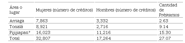 En la costa de Chiapas, la cantidad de préstamos (en miles de pesos) y el número de microcréditos que han sido otorgados a los hombres y mujeres en Arriaga, Tonalá y Pijijiapan, ciudades que integran la zona Istmo-Costa de Chiapas, durante el año 2016, se muestran en la Tabla 1.
