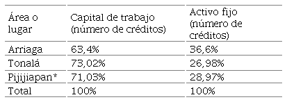 De los microcréditos otorgados, los porcentajes utilizados como capital de trabajo y activo fijo durante el año 2016 (ver Tabla 2), puede verse que hay un elevado porcentaje (más del 60 %) de los préstamos que se utilizan para la compra de mercancía y materia prima para los pequeños negocios que emprenden; y un porcentaje menor (del 40 %) se utiliza para compra de materiales, equipo y maquinaria.