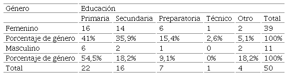 Los resultados indican que la mayoría de los empresarios tienen familiares que dependen de ellos; la mayoría de las mujeres respondieron que, 25 de ellas, lo que corresponde al 64.10 por ciento, que, si tienen dependientes y 14 de ellas, el 35.89 por ciento respondió que no tenían hijos o dependientes. Dentro del renglón de los hombres, 7 de ellos, el 63.63 por ciento dijo que si tenían dependientes económicos y el restante 4 de ellos dijeron que no los tenían. De acuerdo con el resultado en educación (ver Tabla 3), se tiene la siguiente información: