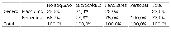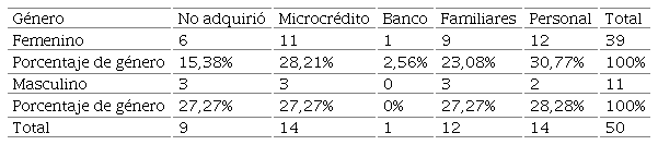 Pero al mismo tiempo, estas personas recurren a diversos medios para obtener dinero, por ejemplo, el 28,21 % de ellas recurrió a los microcréditos para establecer su negocio; el 30,77 % recurrió a sus ahorros personales; el 23,08 % recurrió a sus familiares para obtener dinero; en cambio, el restante 15,38 % no adquirieron ningún préstamo, y solo una de ellas utilizo la banca comercial corresponde al 2,56 %. El comportamiento de los hombres es similar.